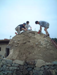 2003.6.8 愈々、ドームの鉄筋の間に石をはさむ作業に入りました。