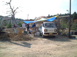 2003.8.03 残暑の中、テントの下でモルタルを練る。